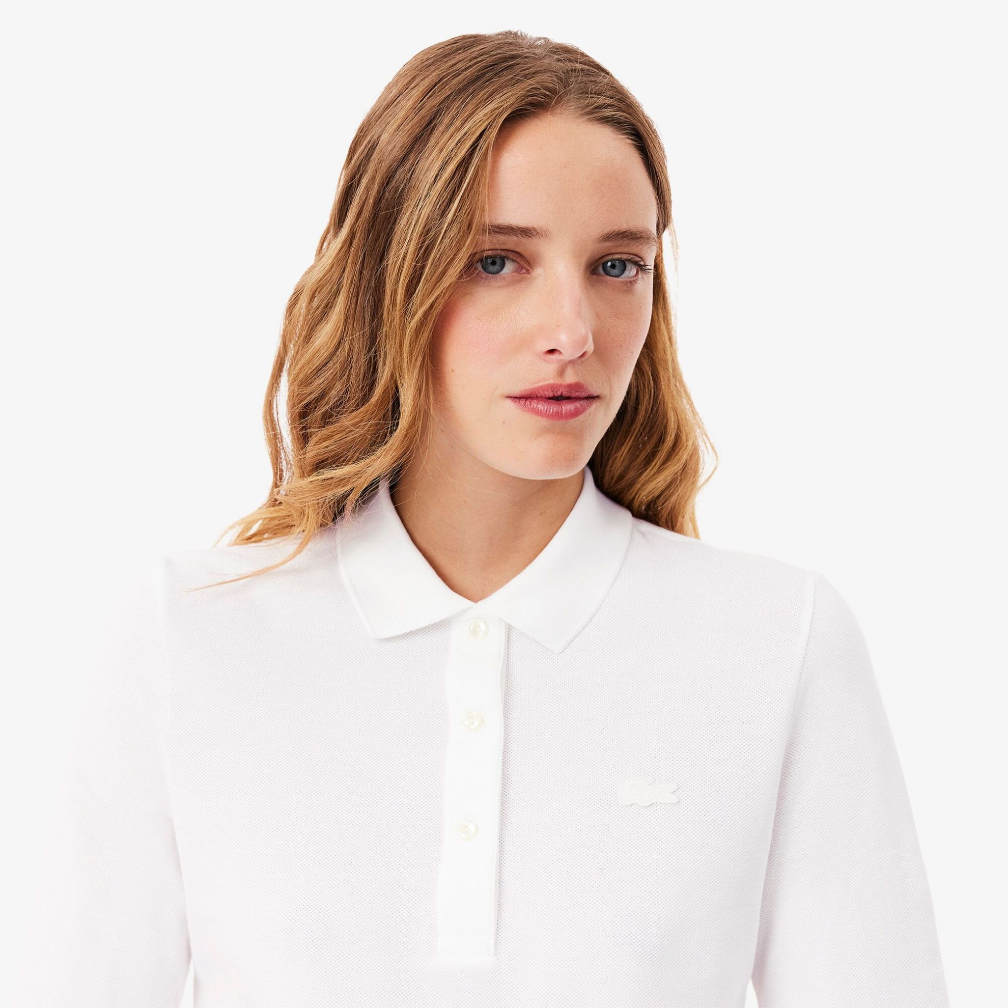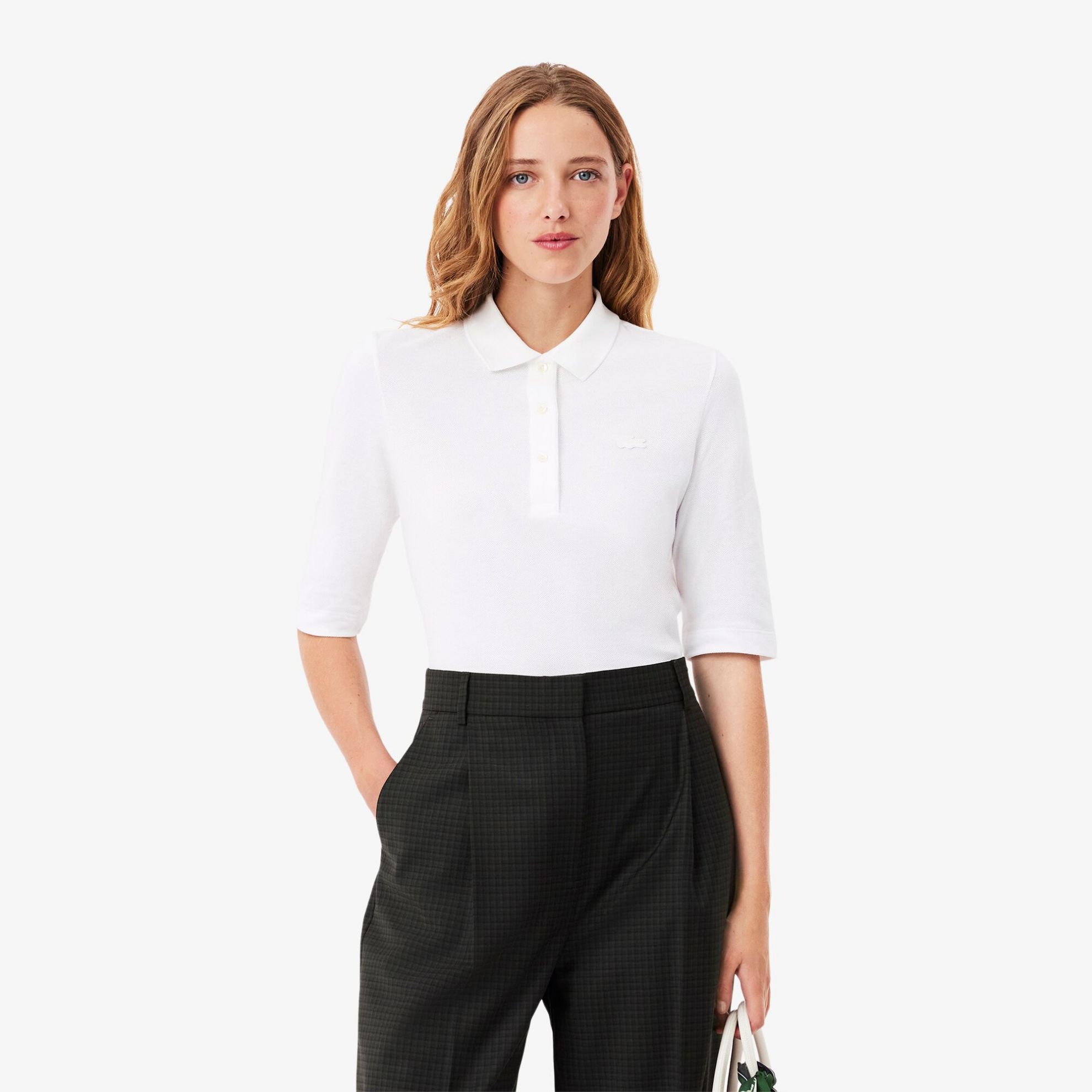 Ένα θηλυκό, μίνιμαλ στυλ της κλασικής polo μπλούζας από τη Lacoste, τους δημιουργούς του σχεδίου το 1933. Κατασκευασμένη από απαλό, κομψό ύφασμα πικέ με εντυπωσιακά μανίκια τριών τετάρτων. Ένα απαραίτητο κομμάτι γκαρνταρόμπας με εκλεπτυσμένες λεπτομέρειες φινιρίσματος, συμπεριλαμβανομένου του τονικού κροκοδείλου-σήματος.