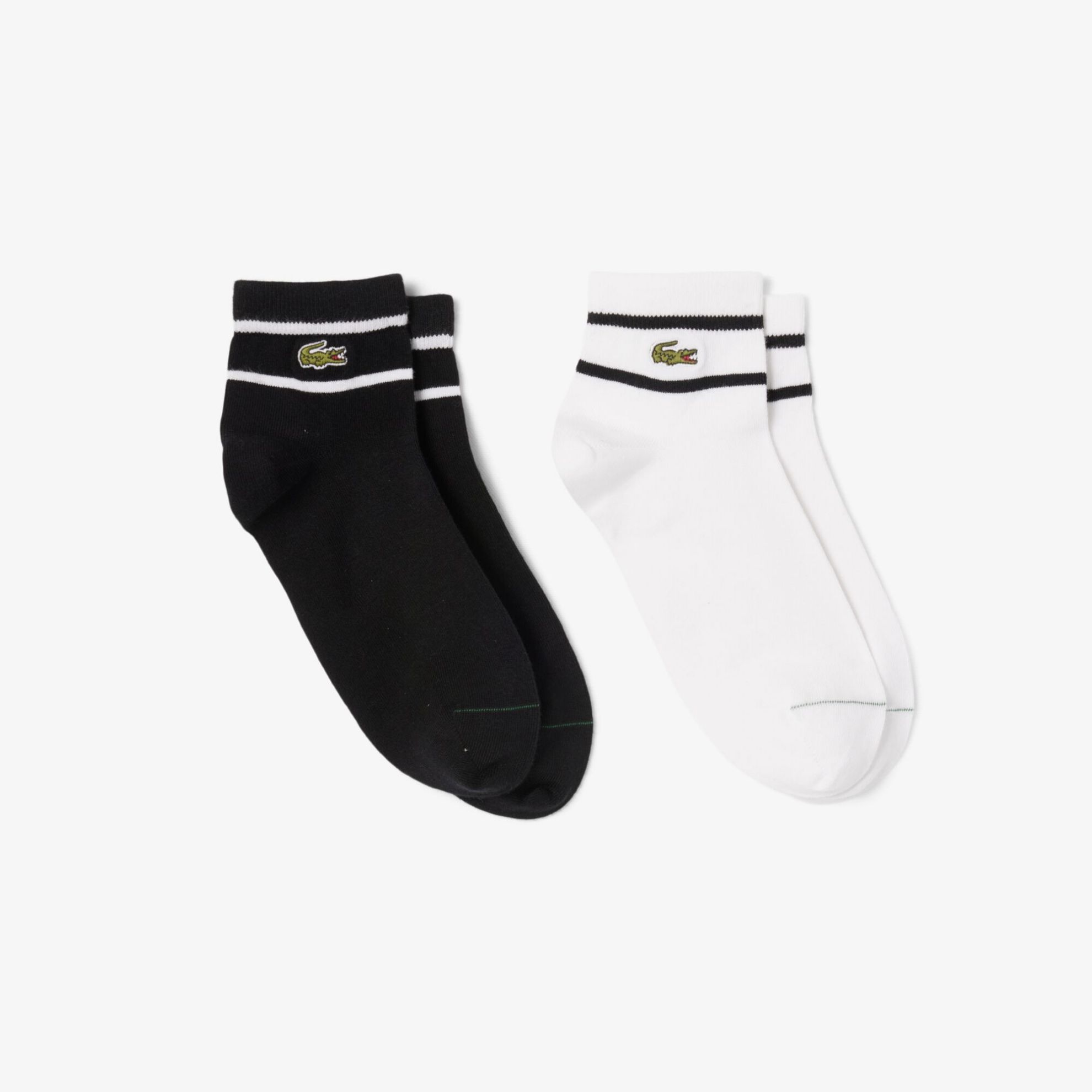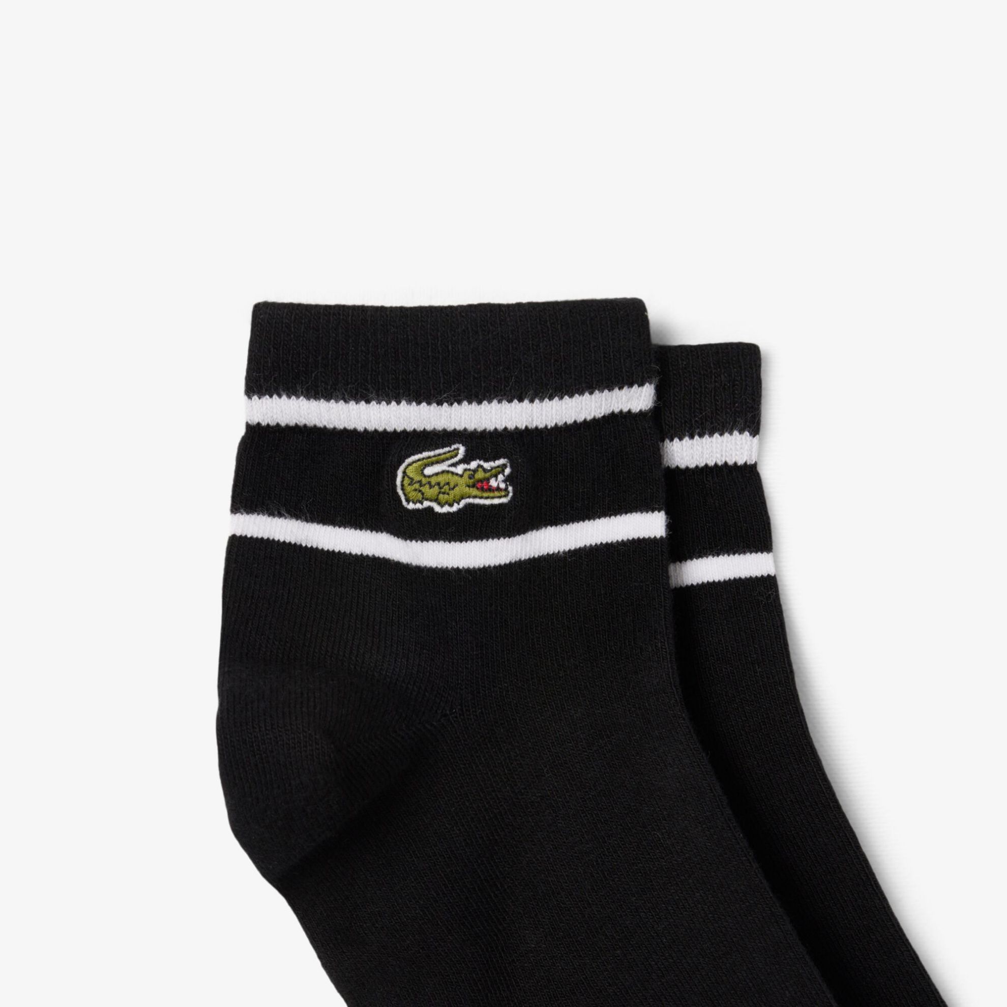 Δύο ζευγάρια ριγέ βαμβακερές κάλτσες από βαμβακερό jersey της Lacoste, ειδικοί στην αθλητική ένδυση από το 1933. Το ευέλικτο κοντό κόψιμο τις καθιστά ιδανικές για κάθε μέρα. Κάθε ζευγάρι διαθέτει έναν περίτεχνο κεντημένο κροκόδειλο Lacoste στο πλάι.
